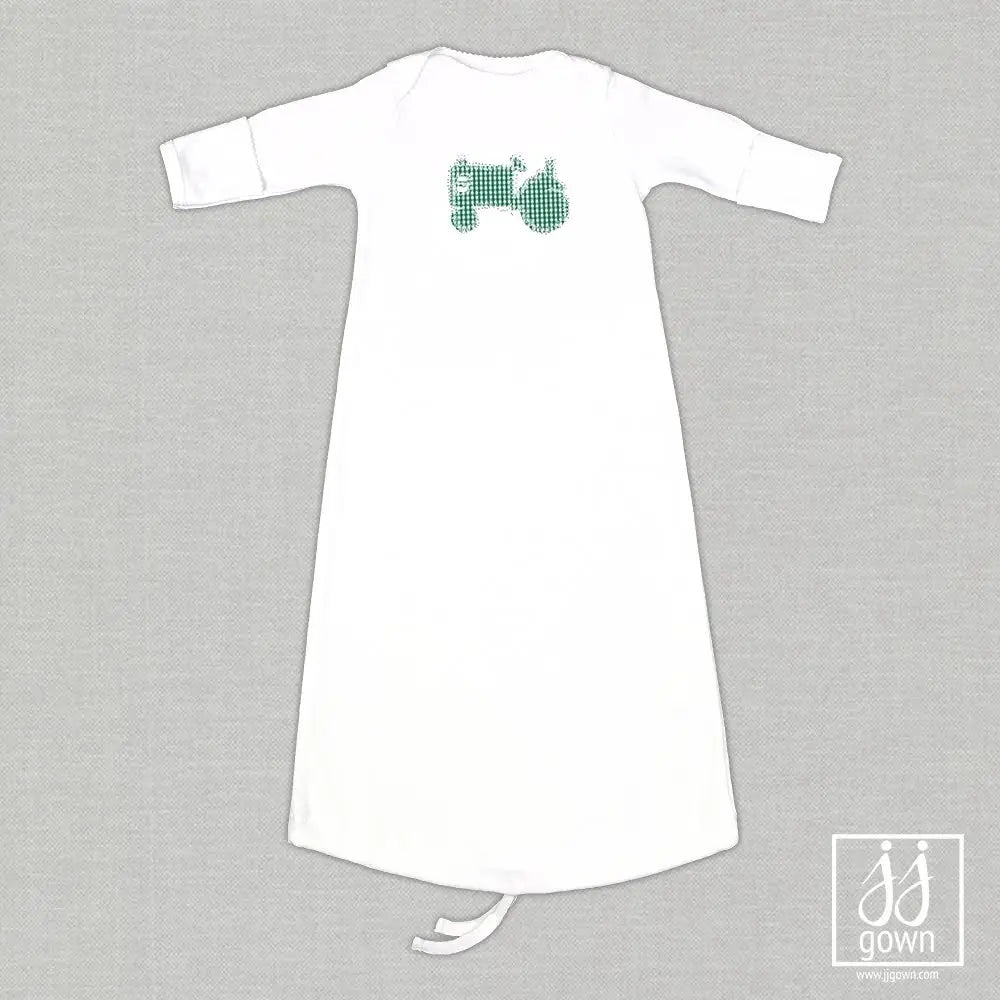 JJ Gown, a brand known for its uniquely designed baby gowns. Each piece is lovingly hand-appliqued, ensuring no two pieces are exactly alike. Crafted from 100% Peruvian pima cotton. Each gown is sewn with love in Nashville, Tenn., reflecting JJ Gown's commitment to quality over quantity. Please note, as each piece is unique, the design on your gown may vary.
