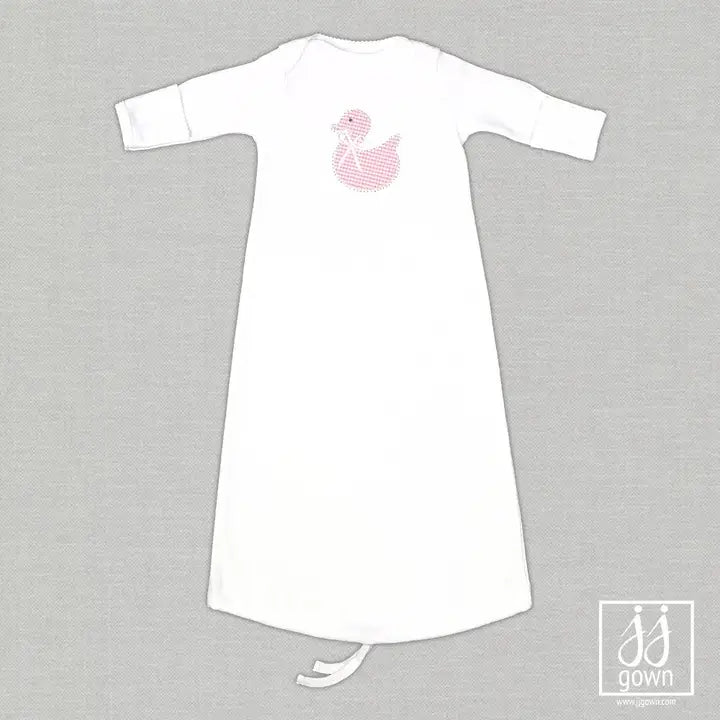 JJ Gown, a brand known for its uniquely designed baby gowns. Each piece is lovingly hand-appliqued, ensuring no two pieces are exactly alike. Crafted from 100% Peruvian pima cotton. Each gown is sewn with love in Nashville, Tenn., reflecting JJ Gown's commitment to quality over quantity. Please note, as each piece is unique, the design on your gown may vary.