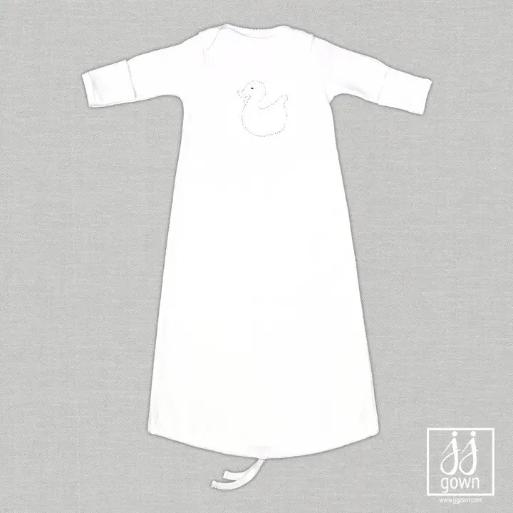 JJ Gown, a brand known for its uniquely designed baby gowns. Each piece is lovingly hand-appliqued, ensuring no two pieces are exactly alike. Crafted from 100% Peruvian pima cotton. Each gown is sewn with love in Nashville, Tenn., reflecting JJ Gown's commitment to quality over quantity. Please note, as each piece is unique, the design on your gown may vary.