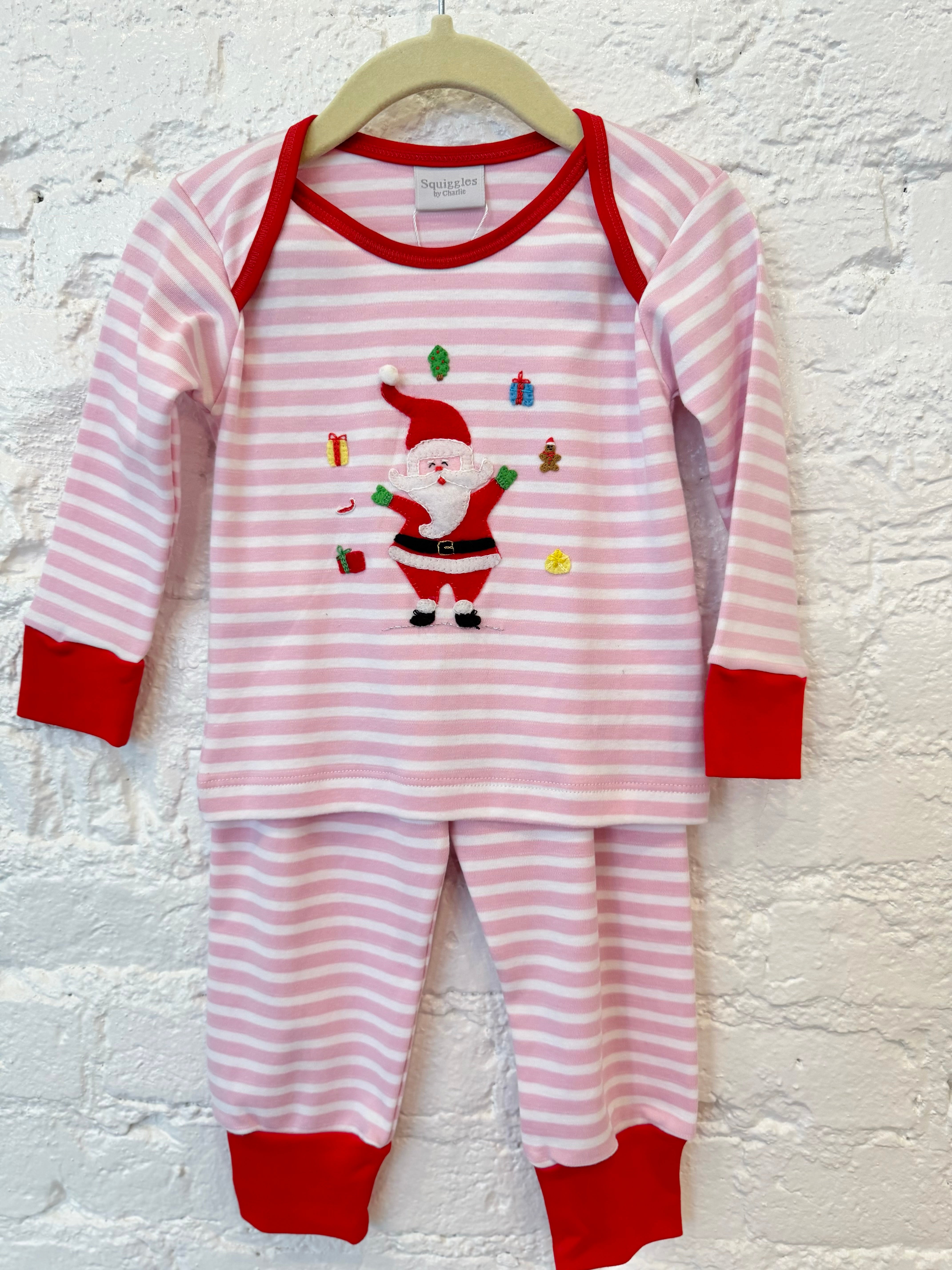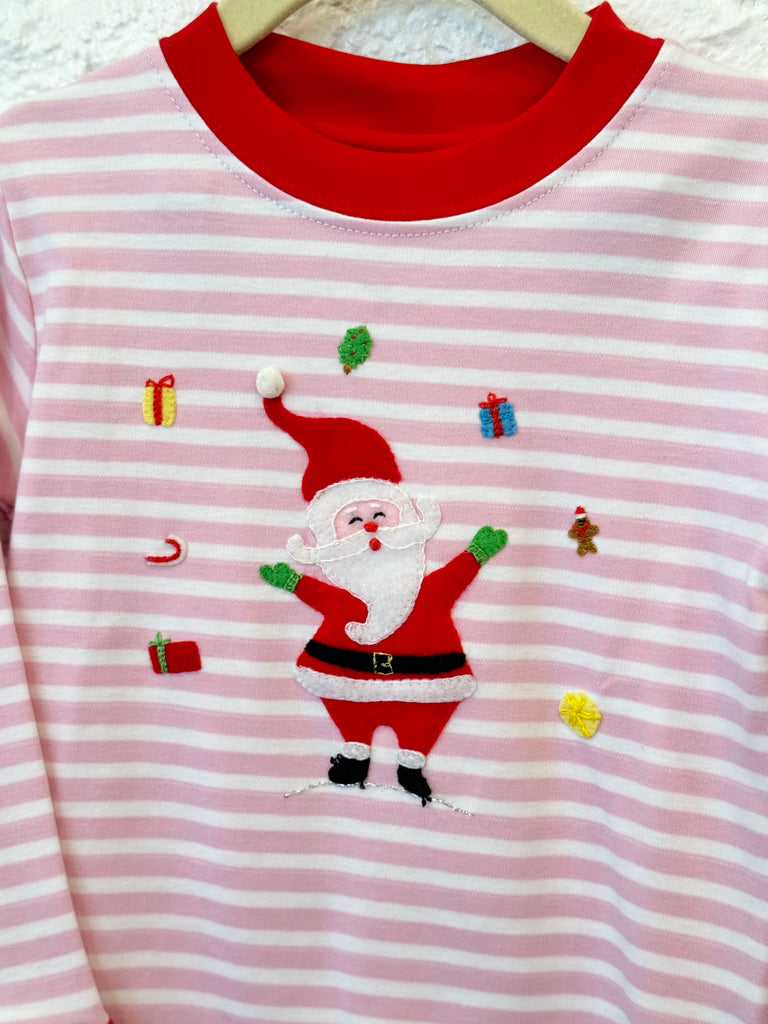 Pink and white stripe pajamas with red trim and juggling Santa applique