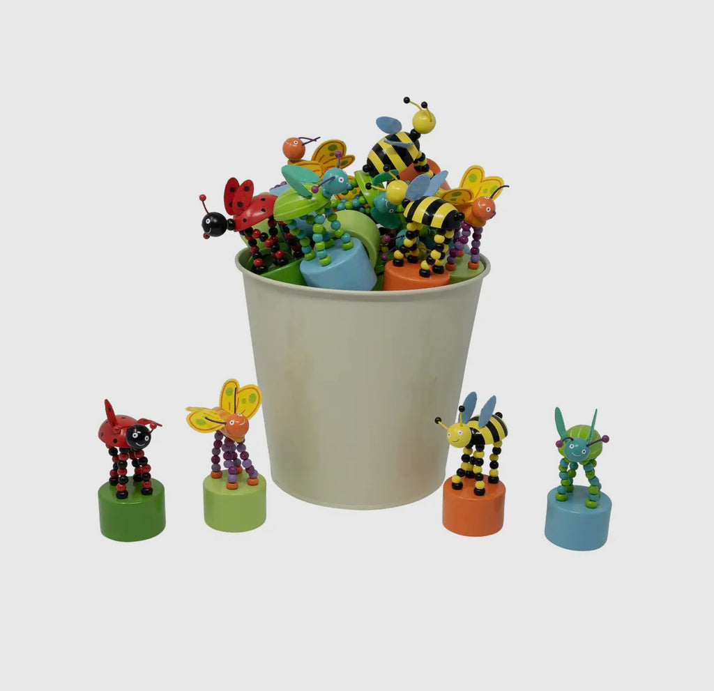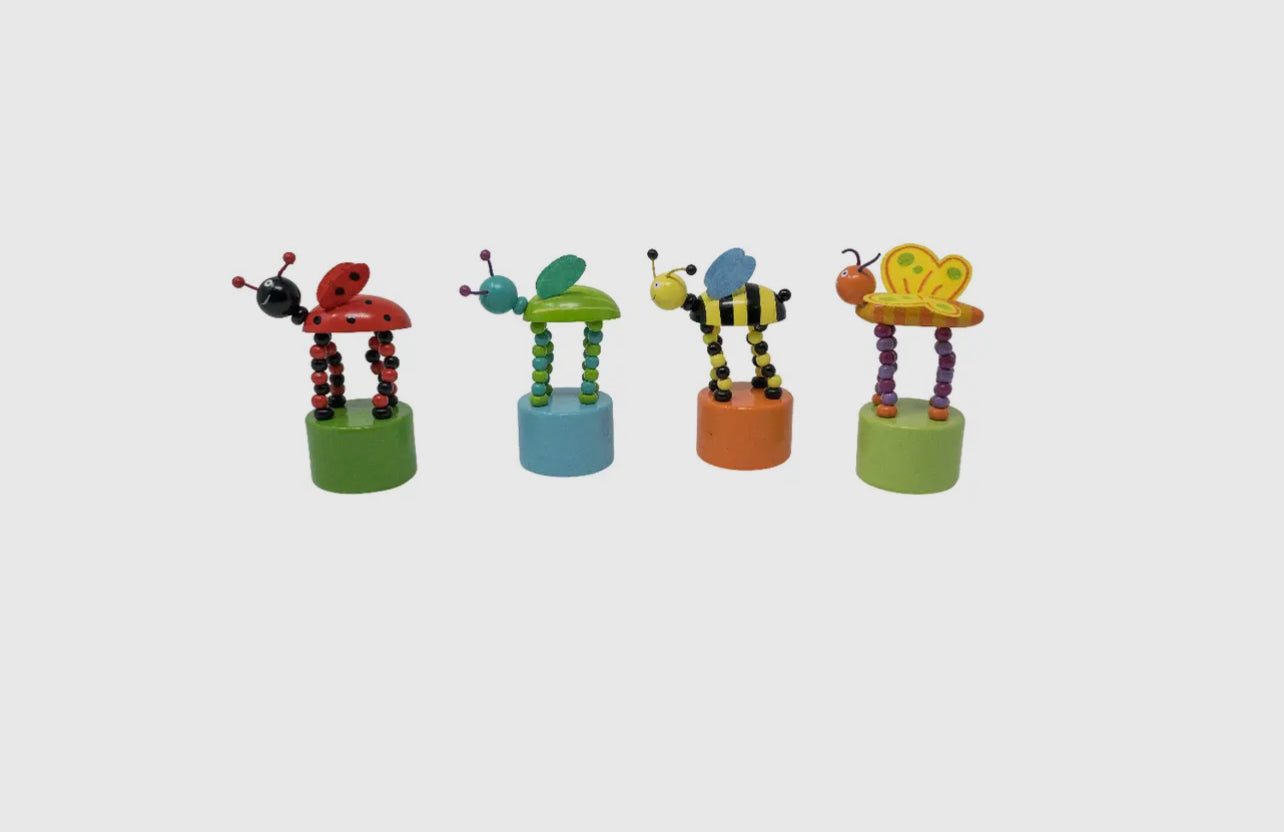 These beautiful, colorful push puppets are full of fun. Push the bottom button and watch them collapse - then let go and they pop back up - ready for more action!