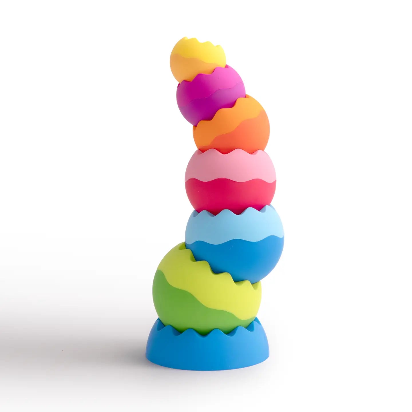 Tobbles Neo - bright and cheerful colors, the physics of motion - and the addition of more tactile clout! The unique grippable texture of Tobbles Neo awakens touch. See those gentle, playful curves? They truly enliven tactile experiences. Young minds revel in stacking, toppling, and the discovery of endless ingenuity with Tobbles Neo. Six uniquely weighted pieces balance, neatly nest, and incessantly spin beyond your expectations. Gratifying to hold in your hands, weighted to invite investigation, and likely to be swiped from your possession. Little hands can’t get enough of the stacking, toppling, spinning, balancing, wobbling, tilting, and wiggling! Another welcome invitation to timeless play.