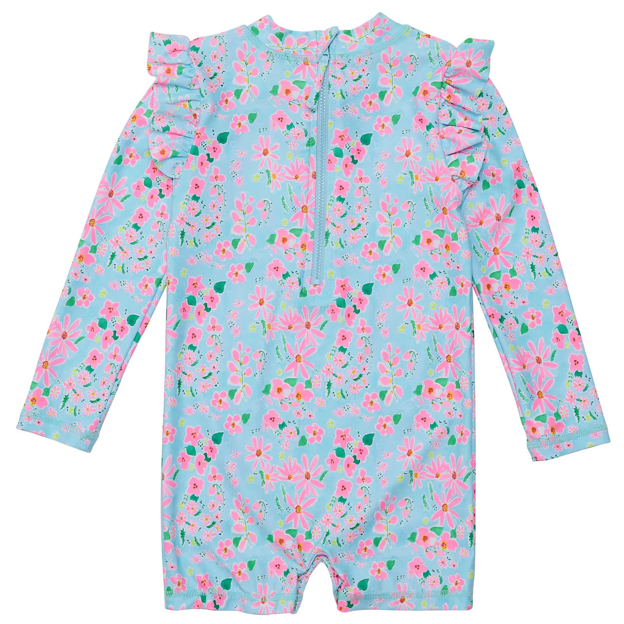 Your little one can play in the sun safely in this long-sleeved baby sunsuit adorned with a charming daisy print and playful shoulder frills. The convenient zip closure at the back ensures easy dressing, while the raw-edged frills add a touch of whimsy to this essential piece for sun-filled adventures.