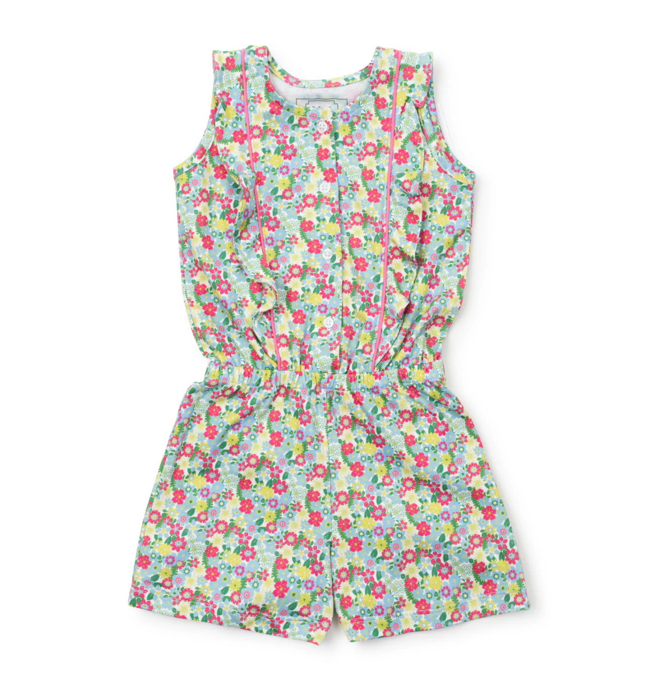 Girls' sleeveless pima cotton romper with floral detail down the front. Romper buttons down the front. Features an elastic waistband.