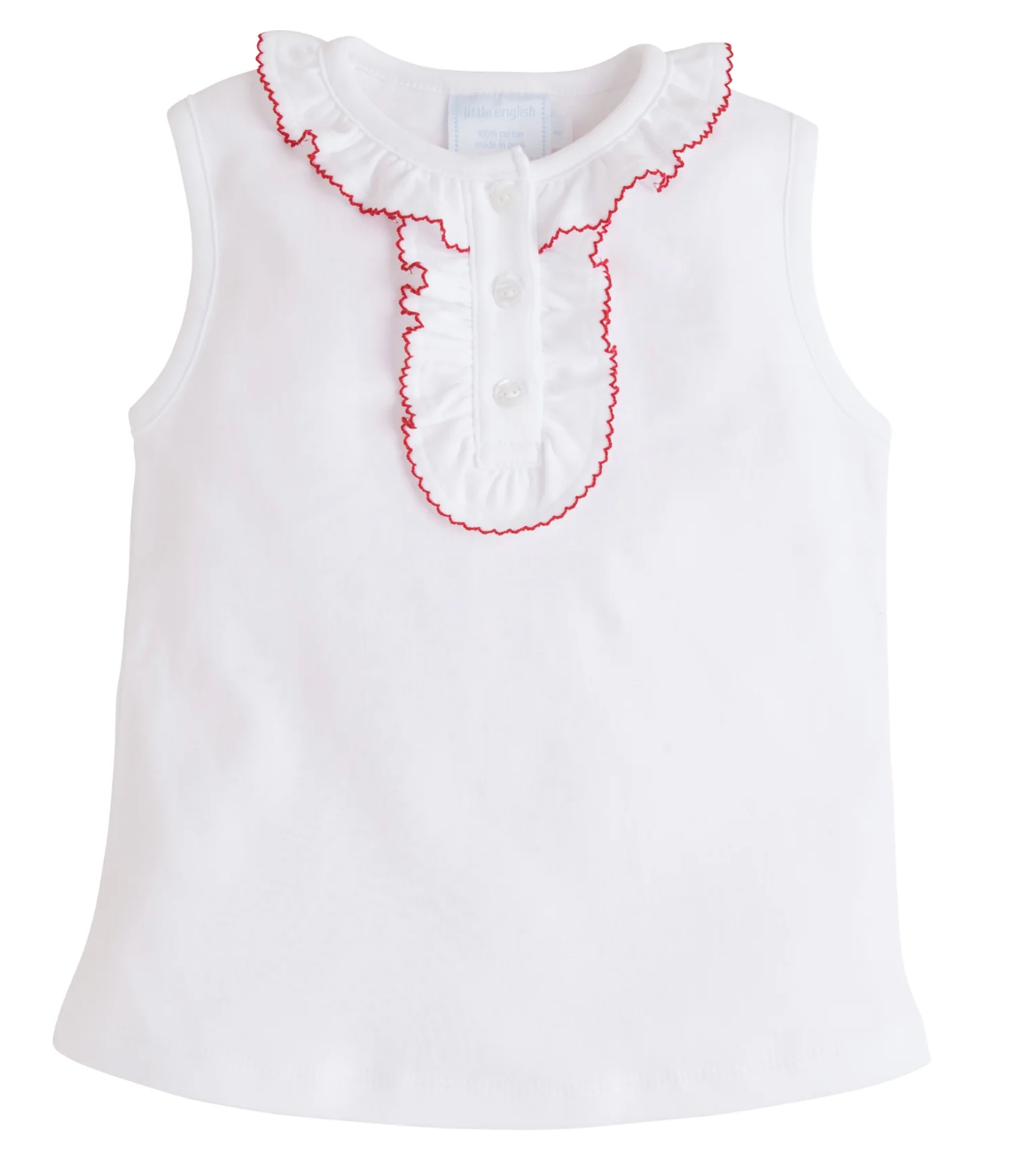 Our favorite little pima top! The Ruffled Henley is a staple in any girl's closet. With sweet ruffles that are trimmed in red picot, you'll be able to match this basic with her favorite shorts all spring and summer!
