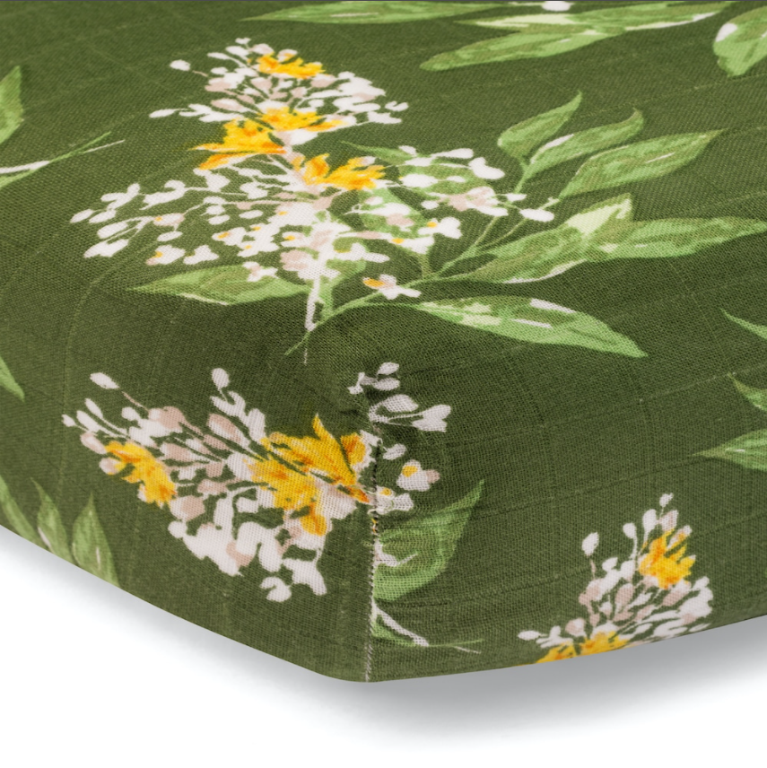 The extra soft, lightweight, and breathable weave of the Green Floral Bamboo Muslin provides year-round comfort.