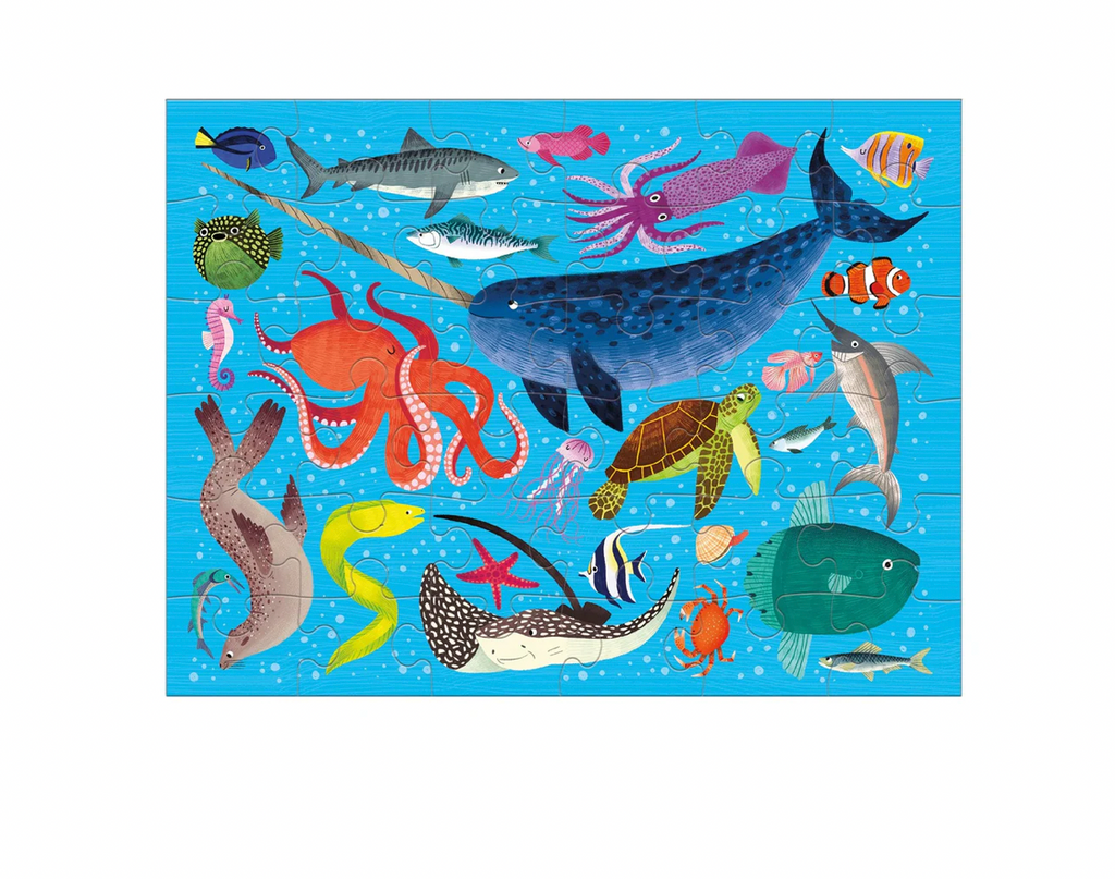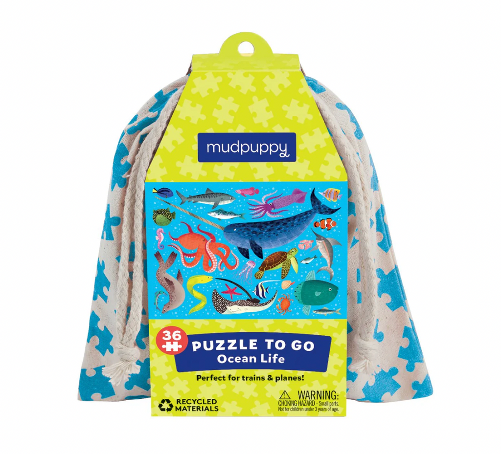 Mudpuppy's Ocean Life Puzzle to Go features a colorful illustration of popular sea animals including an octopus, stingray, sea turtle, seahorse, and more.