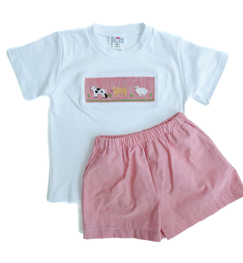 The Smocked Farm Animals T-Shirt and Short Set for Boys includes a white t-shirt with smocked farm animals, paired with red mini stripe shorts. Designed for toddlers and boys aged 12M-5, it brings classic southern style and heirloom-quality charm to your little guy's wardrobe.