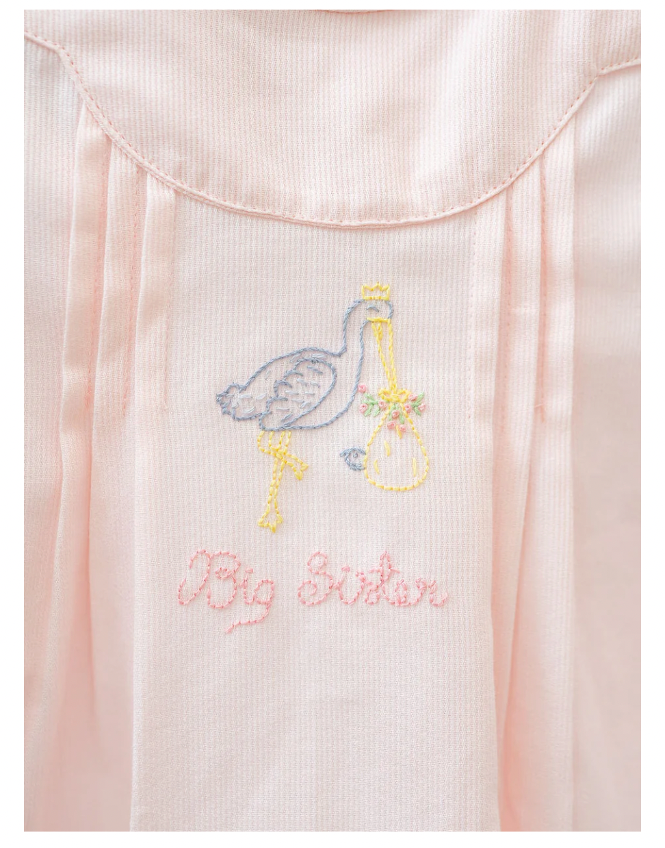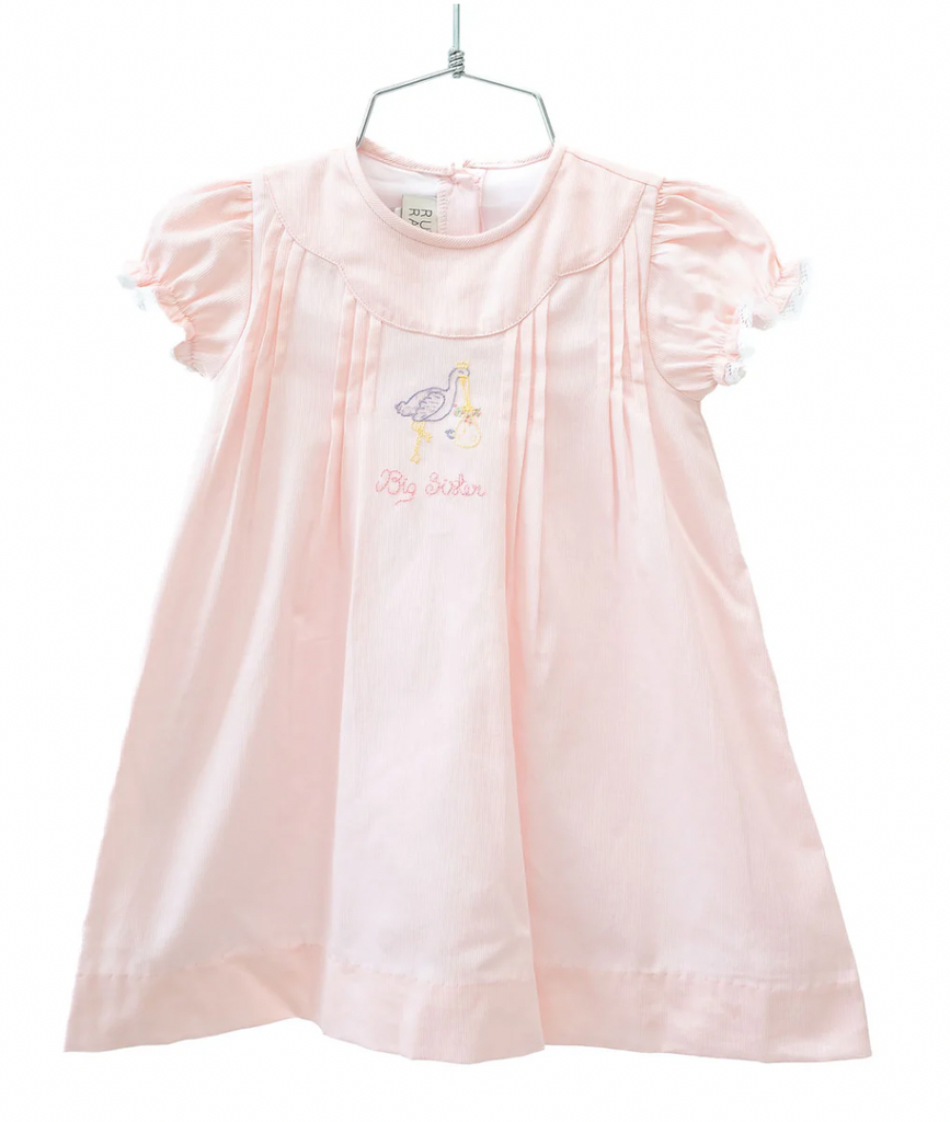 Celebrate your little girl’s new role in style with this timeless Big Sister Stork Dress! This classic pink dress features intricate stork embroidery and "Big Sister" lettering, making it a heartfelt choice for special moments and family photos. The delicate lace-trimmed sleeves and heirloom-quality design add an extra touch of charm, creating a keepsake-worthy outfit for unforgettable occasions.