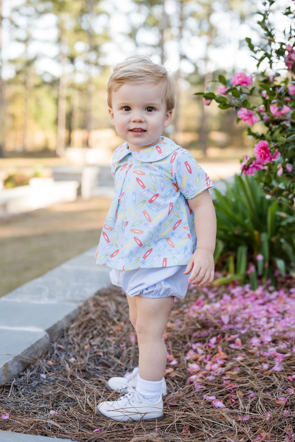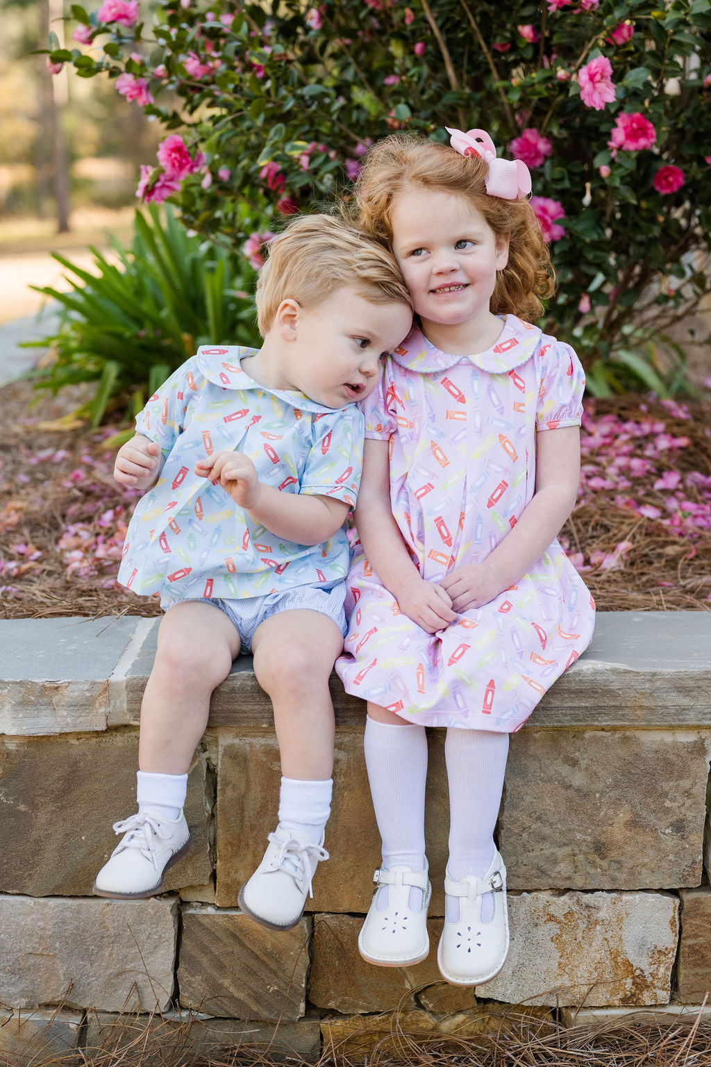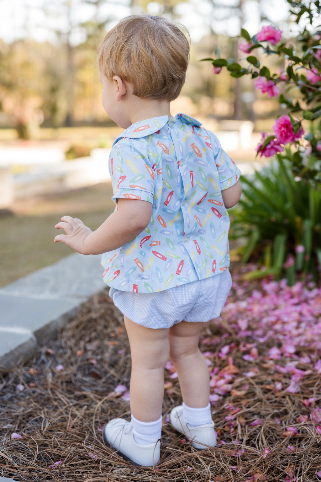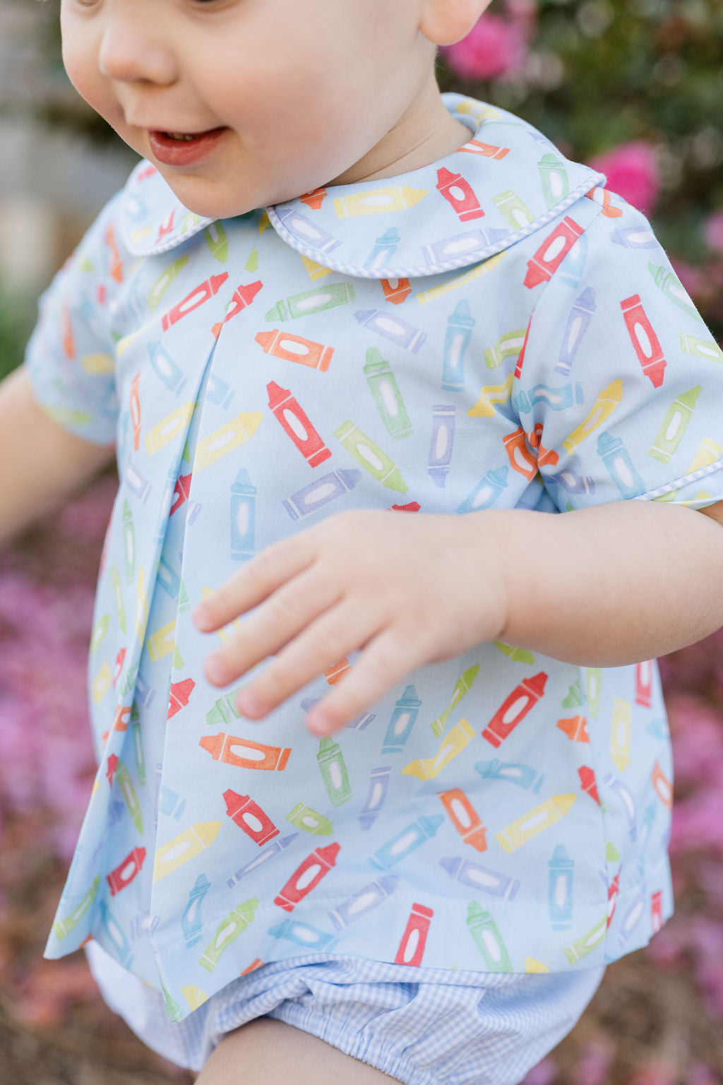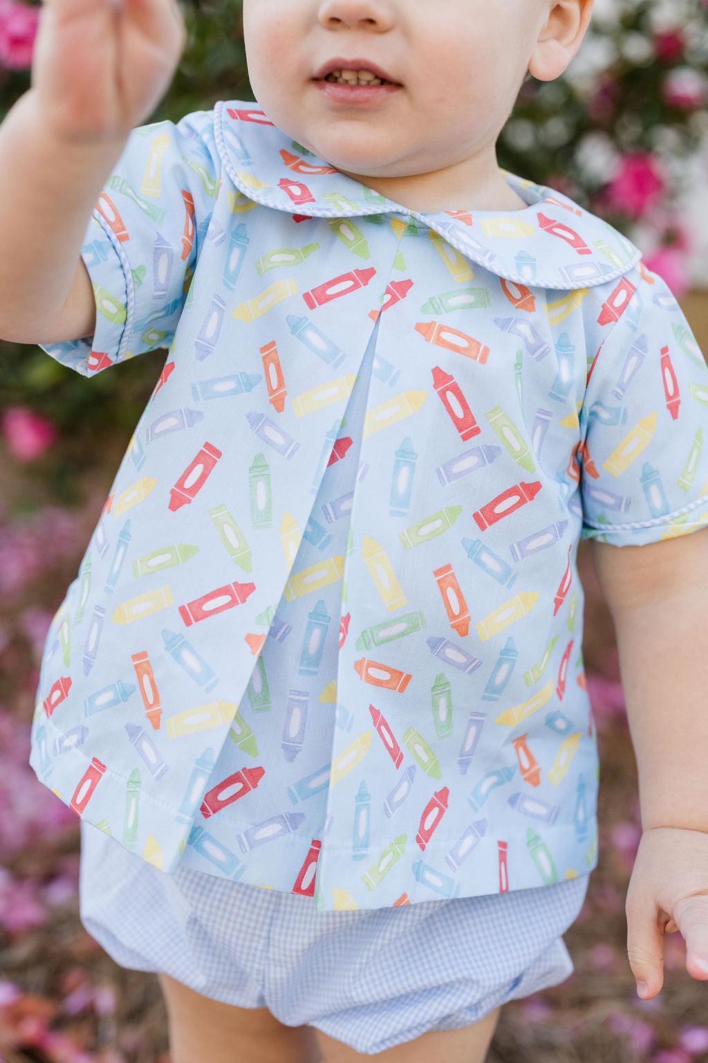 Woven diaper set in an adorable blue crayon pattern. Perfect for a Mother's Day Out program or Pre-K.