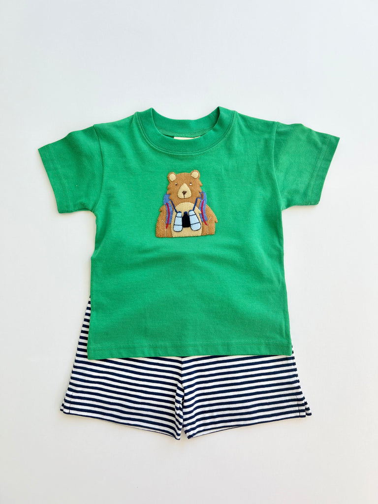 Kelly green tee with hiking bear appliqué center chest. Paired with navy and white knit shorts.
