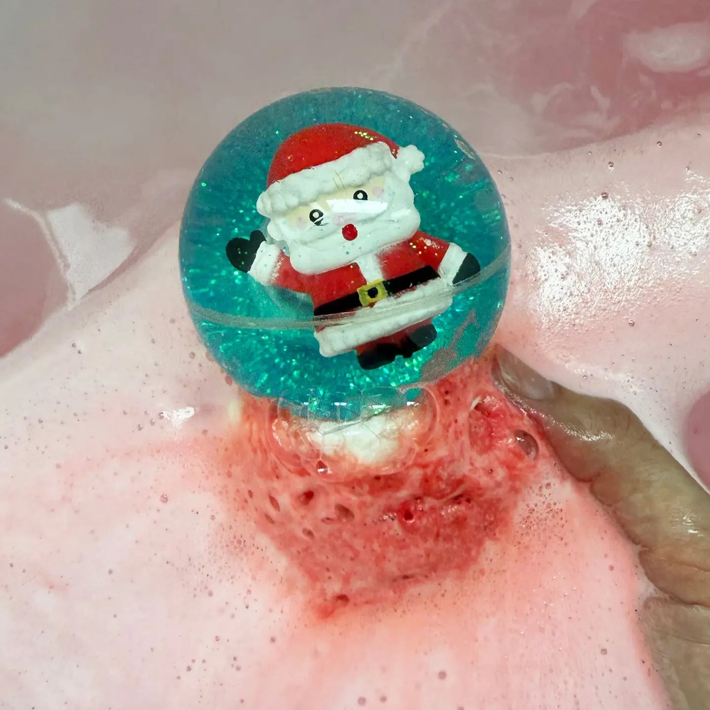The Snow Globe Donut Bath Bomb is topped with a glitter light up bouncy ball! The bouncy ball is attached to the bath bomb with bubble frosting.