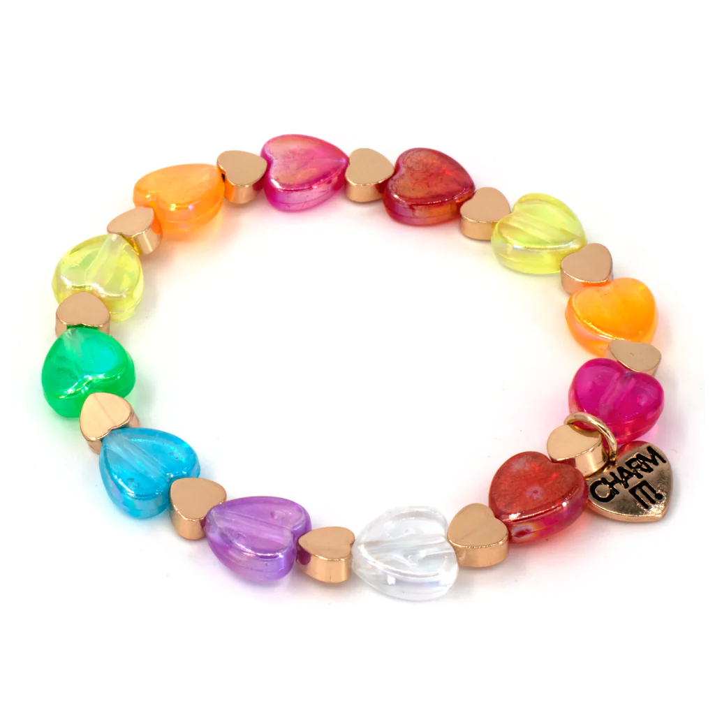 Hello hearts, hello color, hello happiness! This fun rainbow heart stretch bead bracelet puts the party in her arm party stack!