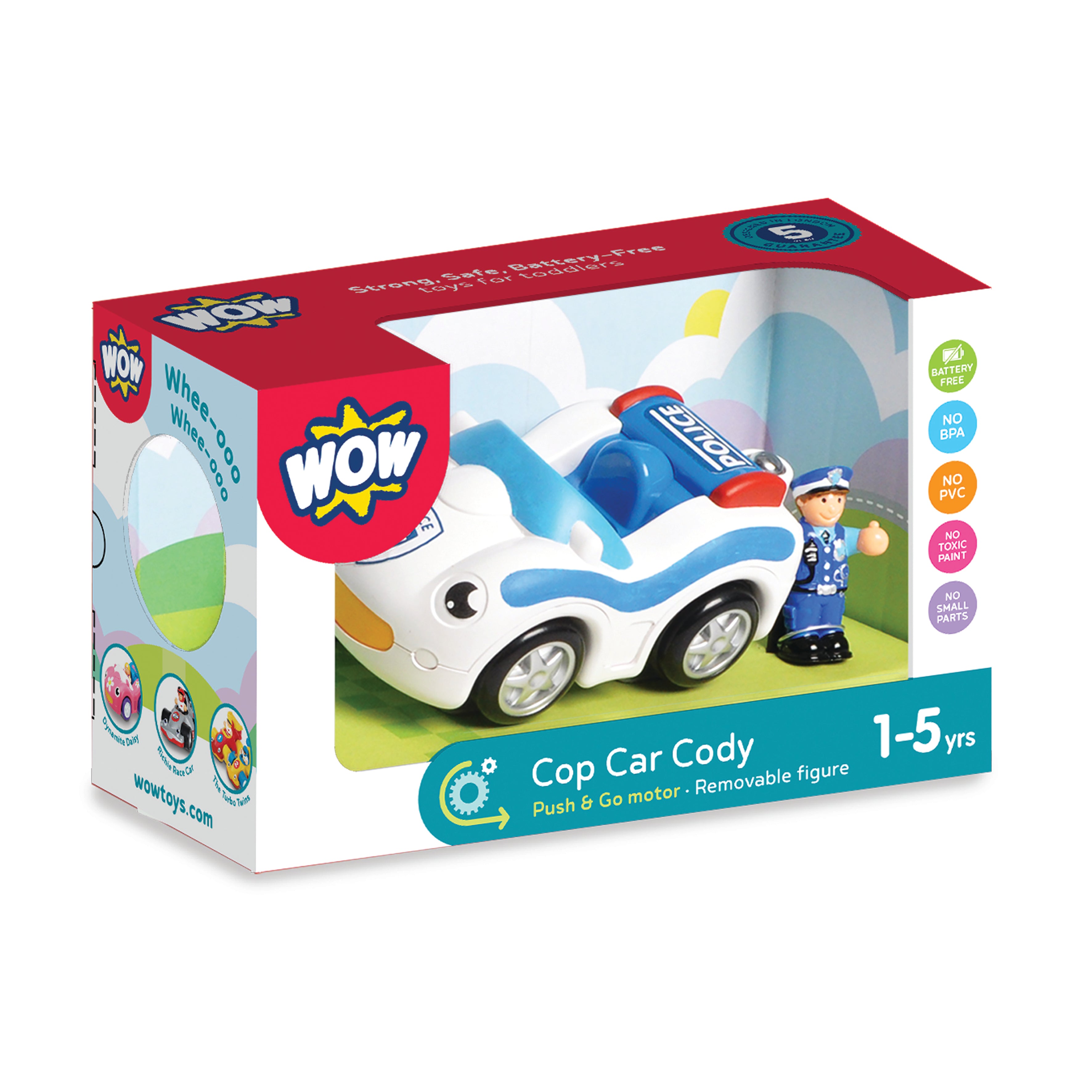 Have fun playing 'Cops and Robbers' by chasing the villains in WOW Cop Car Cody. Fit the policeman Play Friend into Cody's police car driver seat and push him to power his Push & Go motorized engine to speed him straight to the scene of the crime!