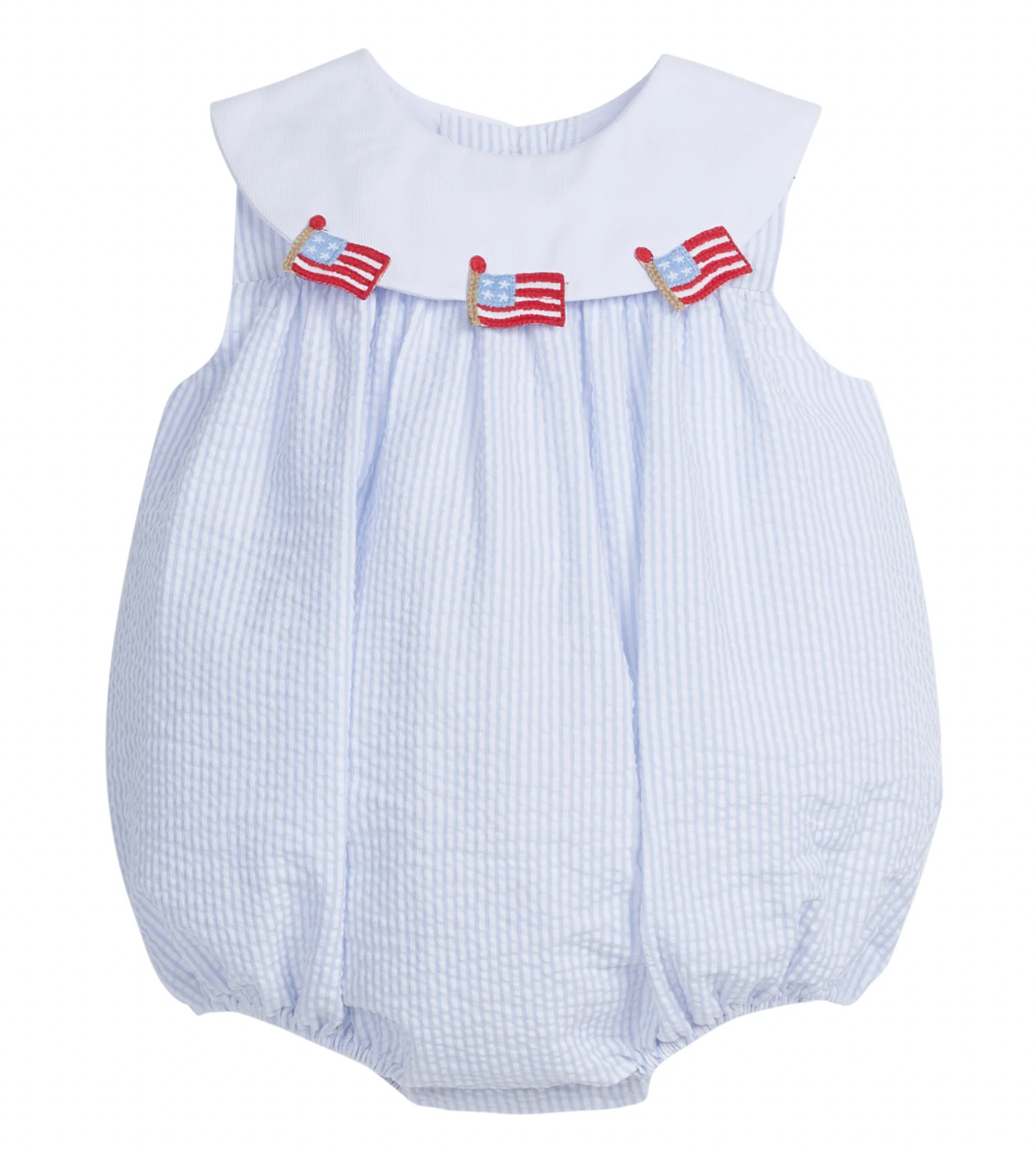 The traditional option for Fourth of July, the American Flag appliques pop against the light blue seersucker stripe. This sleeveless silhouette features a white bib collar trimmed with three American flag appliques. And big sister can perfectly match in the Bib Dress - Flags!