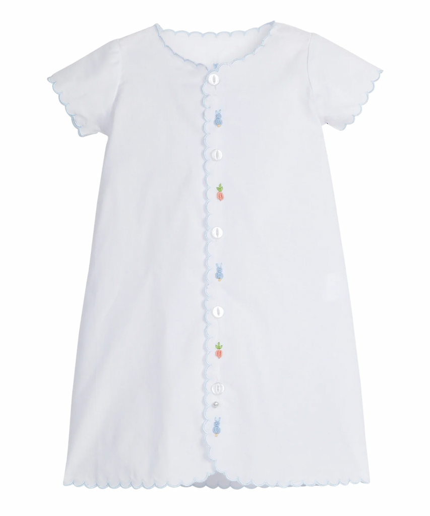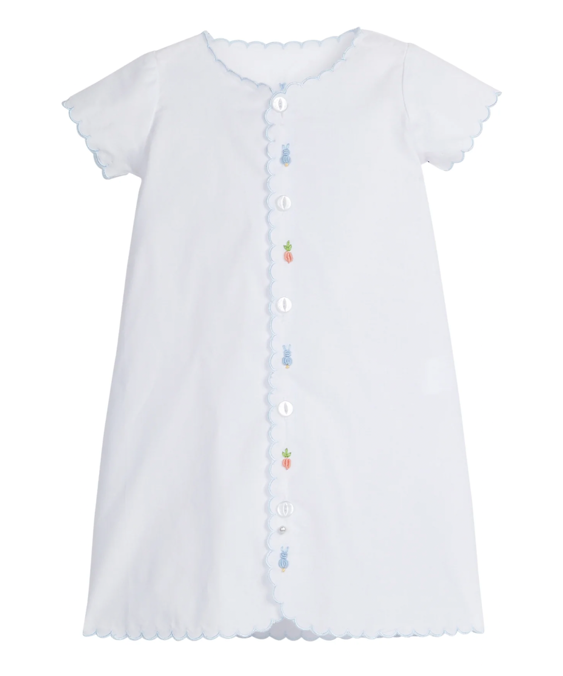 This newborn gown is perfect for your baby boy. Timeless, simple and quite refined - just add a monogram and he will look divine! The precious bunny and carrot embroidery adds the sweetest touch and is a great option for baby's first Easter.