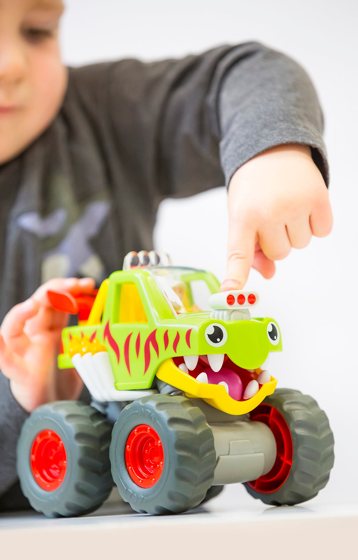 Push down the engine block to open WOW Mack Monster Truck's enormous mouth revealing his set of scary monster teeth coming to get you! Flip up his roof and place his driver into his driver seat and wait for it… Ready…Steady…Go!