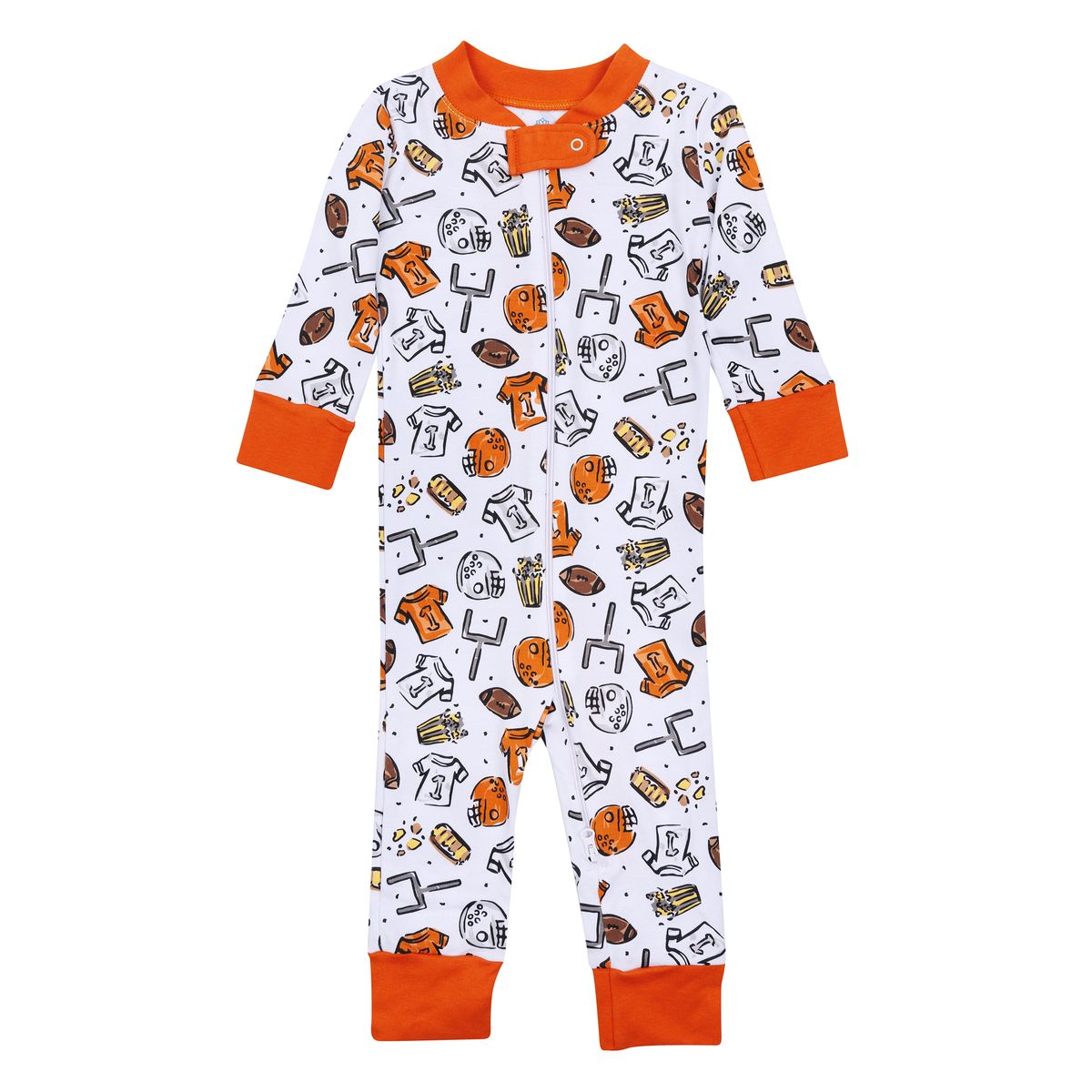 One piece pajama in an orange and white football pattern.