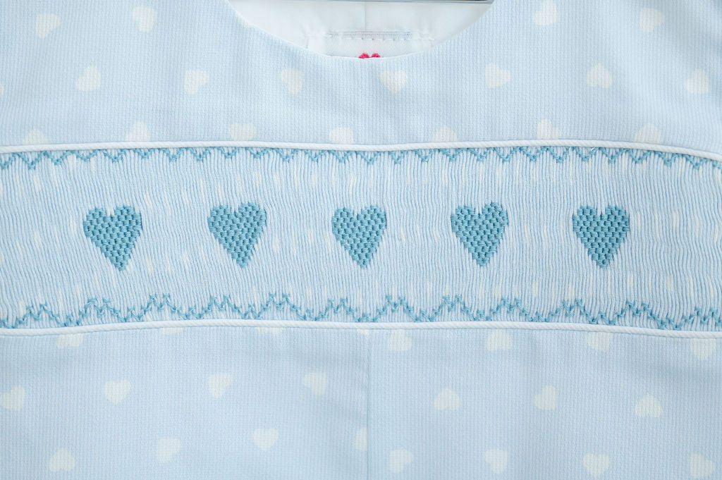 - Hand-smocked blue hearts on the front panel
