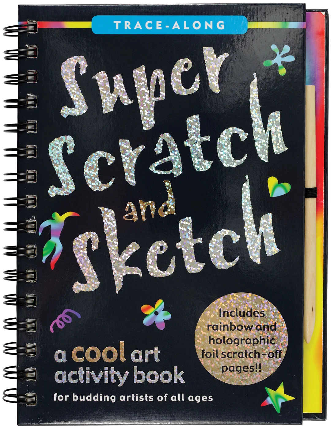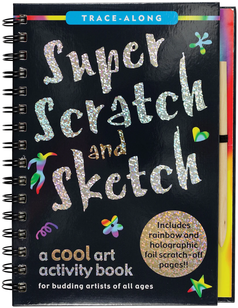 • This is a Trace-Along Scratch and Sketch! Use the wooden stylus included to trace the white outlines on the black-coated pages and reveal the glittery foil and rainbow colors beneath!