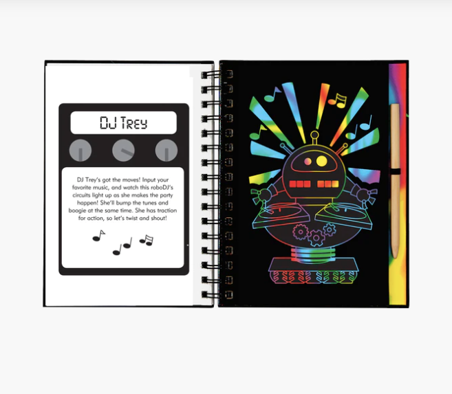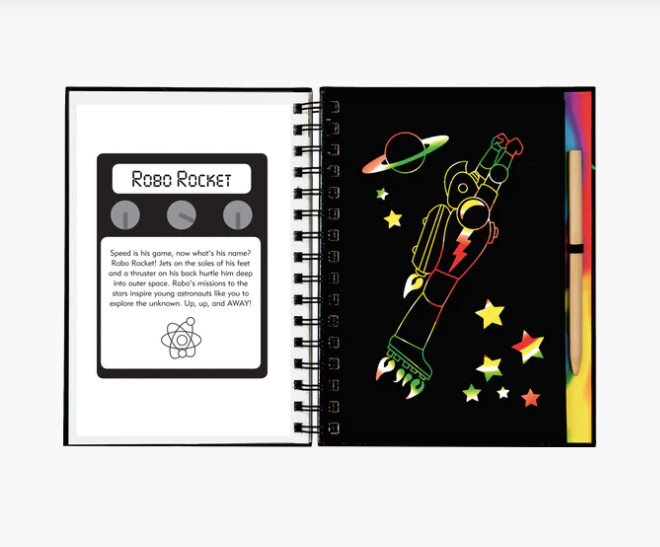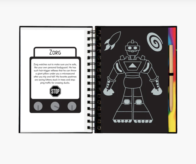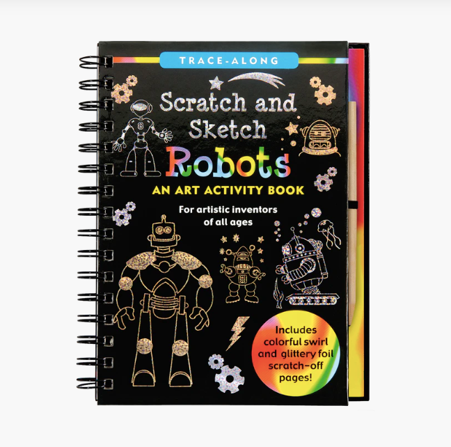 Scratch away the white outlines to bring each amazing automaton to life in swirling colors or shiny foil. Have megabytes of fun drawing and designing your own robots!