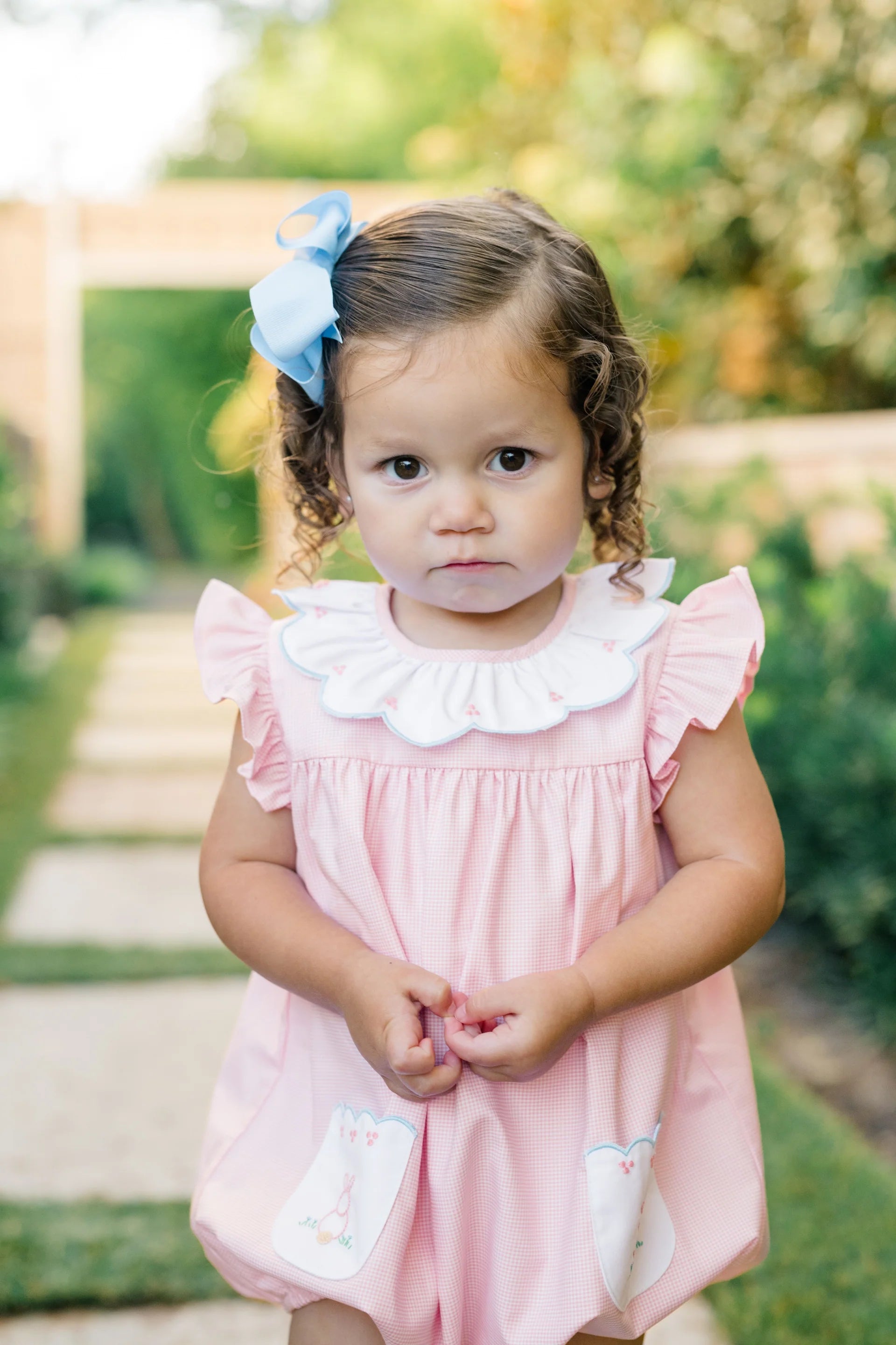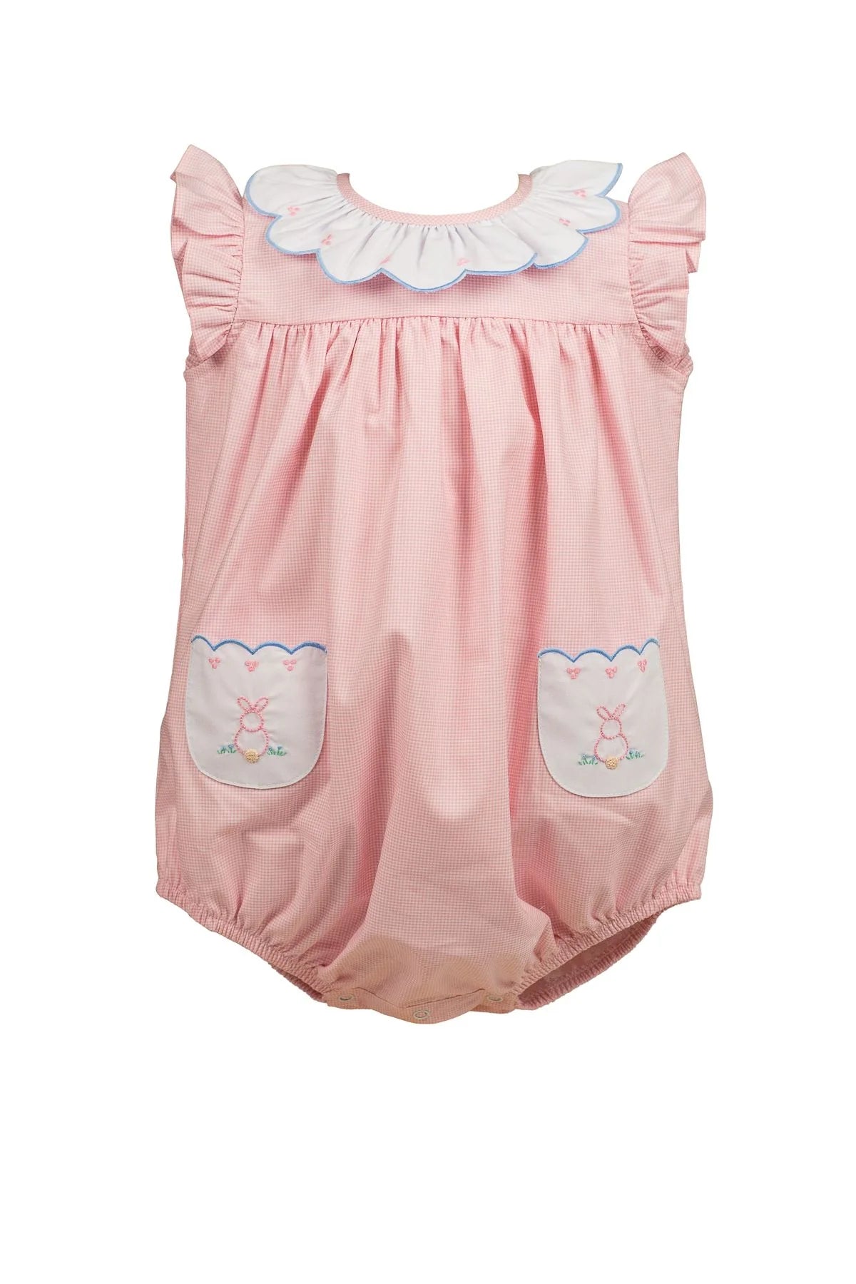 Be dressed and ready for the Easter season in the Clover Bunny collection! Soft pink with blue scallop trim and hand-embroidered bunnies makes for the sweetest styles.
