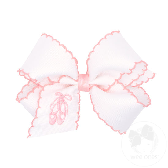 Sweet ballet slippers embroidered on this king size hair bow are perfect for all our little ballerinas. This bow is sure to stay in her hair all day with our patented WeeStay™ no-slip hair clip.